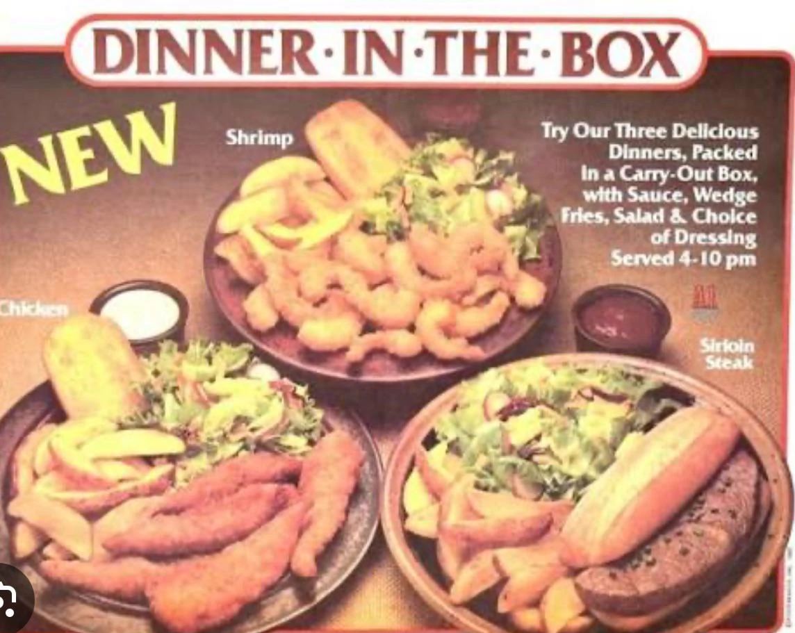 Dinner in the Box was a packaged dinner meal served at Jack in the Box in the 1980s. Available between the hours of 4 p.m. and 10 p.m., there were three entrées to choose from: five chicken strips, 15 fried shrimp with cocktail sauce, or sirloin steak served as an open-faced sandwich with barbeque or A.1. Sauce. Each entrée was served in a cardboard take-out box with a garden salad (including a choice of dressing), garlic bread, and wedge fries.[1]